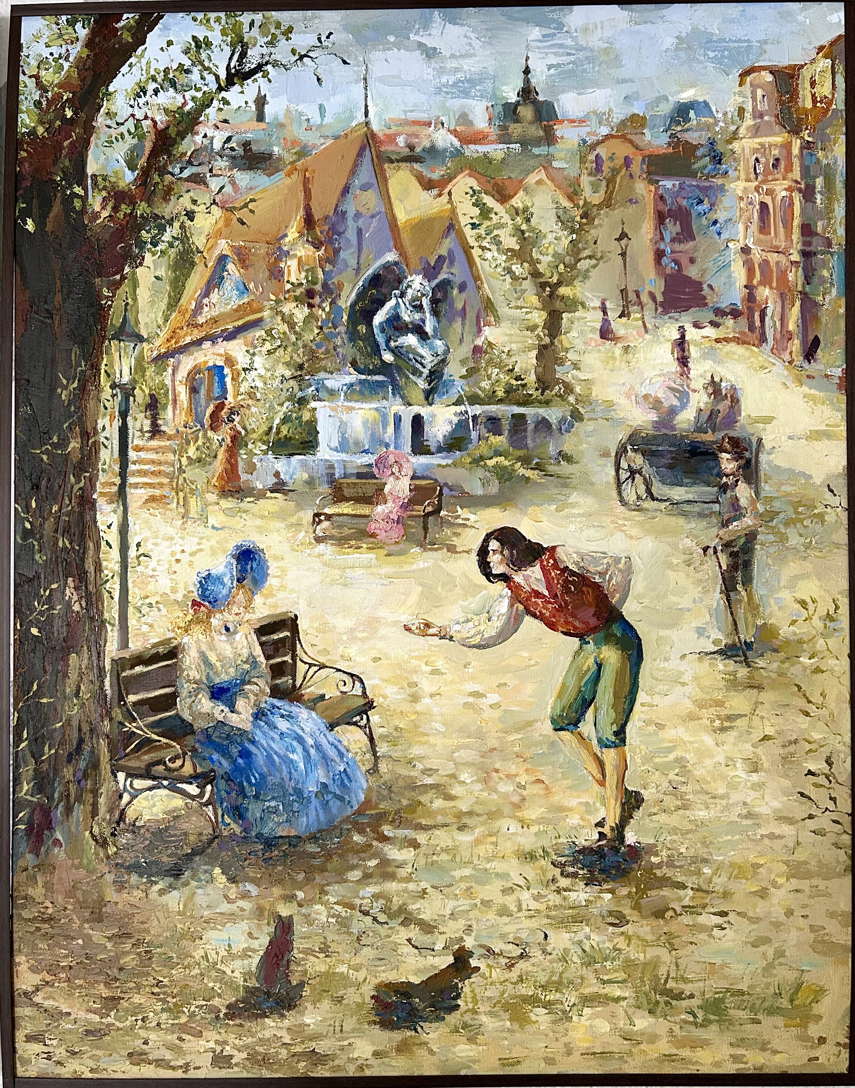 Эти картины переносят зрителя в уютные улочки Европы XIX века — туда, где время течёт медленнее, где звон фонтанов смешивается с тихими разговорами, а вечерний свет ложится мягкими бликами на старинные фасады.